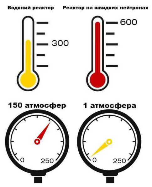 Для порівняння, в реакторах з водяним теплоносієм (таких як ВВЕР-1000 на нині працюючих українських АЕС) тиск первинного контуру порядку 150 атмосфер. Це саме по собі вже диктує надзвичайні вимоги до корпусу реактора і створює небезпеку катастрофи подібної до чорнобильської. І це при 300 градусах, що означає значно меншу ефективність та потребу в спеціальних низькотемпературних турбінах.
