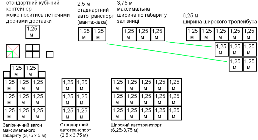 Дрони зможуть носити стандартні кубічні контейнери розміром 1,25 м, а також менші контейнери 0,625 м (1/8 стандартного). Стандарт продиктований шириною автотранспорту 2,5 м, залізничного вагону 3,75 м та широкого тролейбуса 6,25 м — всі ці величини кратні 1,25 м. Можливі комбінації контейнерів з кількох кубів, які носитимуть по кілька дронів одночасно. Такий собі конструктор лего, тільки з летючими дронами доставки. По місту контейнери можуть адресно носити летючі дрони, а на дальні міжміські відстані їх можна масово возити залізницею або автотранспортом.